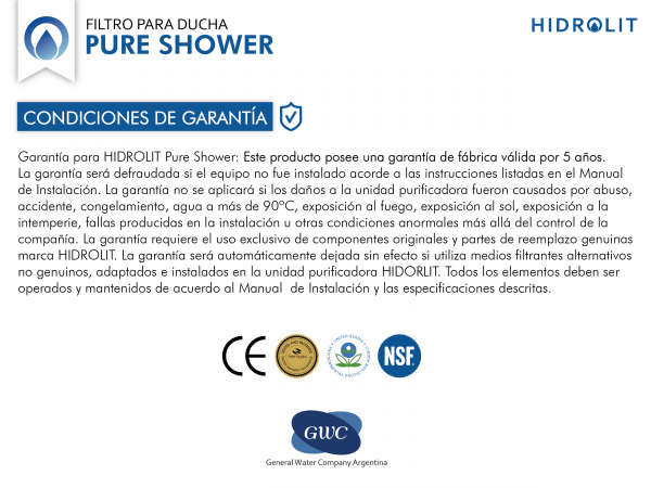 COMPONENTES FILTRANTES: KDF, Carbón activado granular para agua caliente, Filtro de fibras de polipropileno de alta resistencia, sulfito de calcio, Cristales anti Sarro y Ferrita anisotropica magnética.